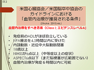 それをふまえて、2015年に米国心臓協会/米国脳卒中協会のガイドラインは改訂され、以下の条件を満たす場合は「血管内治療が推奨されるべき(Class I :エビデンスレベルA)」と述べられています(図2)。